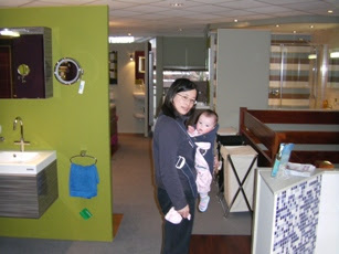 Papa, mama en Amy bij Wooning om naar badkamers te kijken. De meeste tijd zat Amy bij mama in de draagzak, maar papa mag ook wel even spelen met Amy.